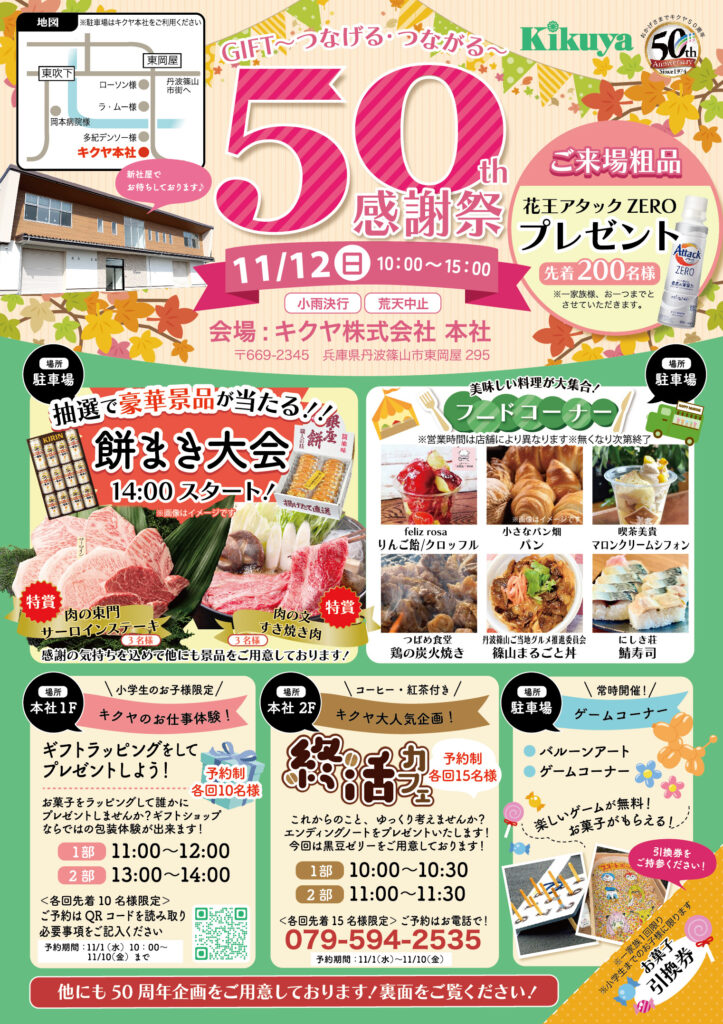 今度は本社にて50周年感謝祭を開催します!日頃の感謝を込めて、楽しい企画をたくさんご用意しておりますので、是非ご来場者ください♪